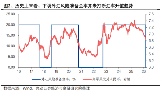 (1)逆周期调节之一:降低外汇风险准备金率。2026年2月27日,中国人民银行宣布将远期售汇业务的外汇风险准备金率从20%下调至0,下调旨在降低升值预期下的购汇成本,为近期过快升值的人民币“降温”。