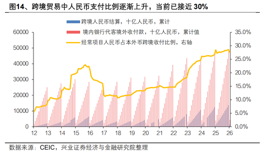 (2)逆周期调节之二:逆周期因子转正且使用量较大。2025年11月以来,逆周期因子从过去的负值(托底贬值压力)转正(控制升值速度),且今年2月下旬使用量进一步走高,逆周期因子不是为了扭转基本趋势,而是为了平滑节奏、抑制过冲、打破单边预期。
