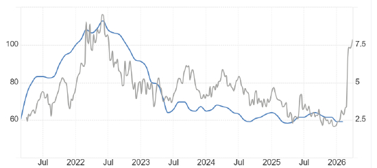 3月31日,ATFX:能源价格是影响美国通胀率的重要因素,上图是美国最近5年CPI数据走势图与WTI价格的叠加,显而易见,两者存在极强的共振性。2022年5月份,WTI创出新高,6月份CPI数据就同步新高;2025年12月,WTI触及阶段性低点,隔月,CPI数据也创出阶段性低点。
