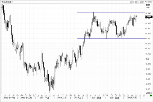 周一公布的中国6月汇丰制造业PMI初值升至50.8,是今年以来首度升回荣枯线上方,创下去年11月以来最高。受此影响澳元兑美元昨日跳涨至最高0.9445,周二澳元守住涨幅,离前期横盘区间上轨不远。