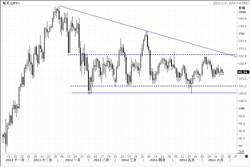 货币:美元/日元 阻力位2:104.00 阻力位1:102.80 即期价格:101.92 支持位1:101.20 支持位2:100.80