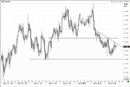 货币:欧元/美元 阻力位2:1.3735 阻力位1:1.3650 即期价格:1.3599 支持位1:1. 3480 支持位2:1.3400