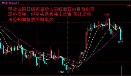 因周四晚间公布的美国上周初请失业金人数降至逾八年低位,暗示就业市场复苏强劲,提振美元美股,另外,乌克兰及中东地区的紧张局势也有所降温,因此现货白银昨日收大阴线,连续破位多个支撑,最低触及4020附近支撑有所反弹,盘面从4150附近开始的下跌目前看并未结束,且破位20日均线后,后市进入下行通道,再次站于20日均线需要一定的时间。因此空头格局,短期做空为主,多为辅。