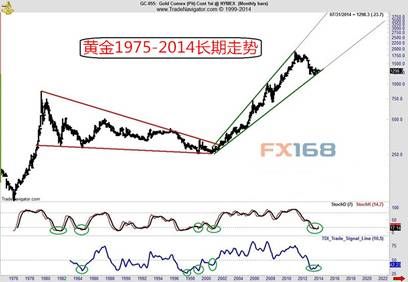 第三阶段:黄金上行脱离2001年底部(255美元左右),在2011年8月升至1900上方。随后回撤至1200水平,分别在2013年6月和12月形成双底。