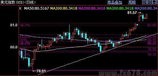 美元指数日内重新回到81.50一线,逼近前期高点81.57。尽管技术层面上关键性支撑见于81.75附近,但是收盘突破81.57还是会让多头士气得到明显的提振。在还有英国、欧元区和日本三大央行决议悬而未决的情况下,美元的上涨行情现在正处于关键时刻。确认强势突破81.57/75则将宣布中期上扬行情的再度启动,而本周内若再一次冲高回落,则很有可能导致多头的明显了结平仓。