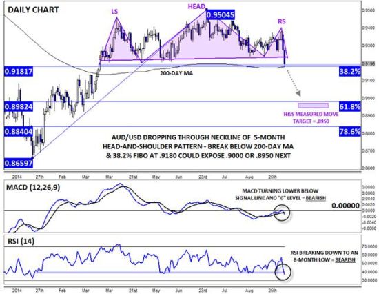 3月底以来,澳元/美元一直陷于狭窄的区间内,其中支撑位在0.9200,阻力位在0.9500。但期间汇价创下了一个大型头肩顶形态,其中颈线在0.9200附近。提醒不熟悉的读者,此经典价格波动形态显示出上涨趋势(高点和低点都上移)转向下跌趋势(高点和低点都下移),通常出现在图表的重要高点处。截至我们发稿,汇价交易于0.9200下方。所以,今天收盘可望证实头肩顶形态。