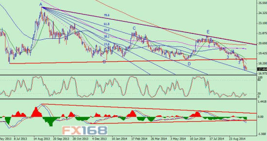 从这张图上我们可以一眼看出银价已经跌破自去年8月份以来形成的震荡三角形,并且MACD指标也配合性地出现三角形下破迹象,显示银价下行是有技术面作为支撑的。