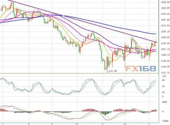 FX168讯 现货黄金周一(1月12日)亚欧盘中震荡上行,一度刷新一个月高点至1231.00,随后回吐大部分涨幅,交投于1220美元/盎司。