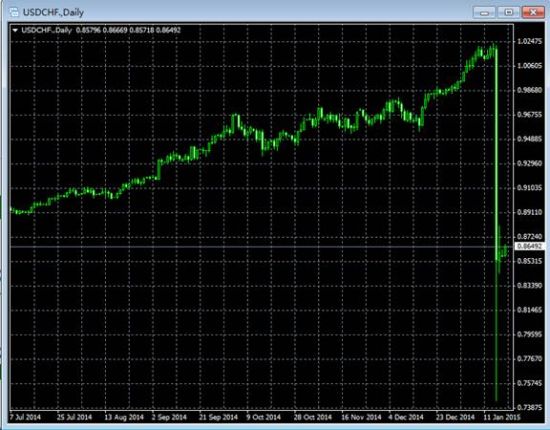 于此同时,由于在上周末瑞郎对美元和欧元几小时内的2000余点升幅致使一些杠杆化的外汇平台商蒙受巨大打击: