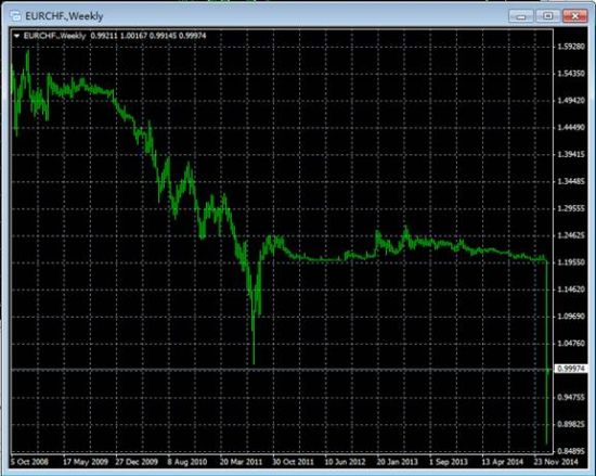 回顾在第二次世界大战期间瑞士的不光彩一幕:瑞士政府在经济上向法西斯国家输血;二战时瑞士一直让贯穿阿尔卑斯山脉的具有战略意义的15公里长的圣哥大隧道(这也是世界上最长的公路隧道)向德国和意大利开放;拒绝帮助受迫害的犹太人;瑞士银行侵吞犹太人财产,充当纳粹黄金保险箱……笔者上述的这些虽然不能与本次瑞士瑞郎取消与欧元的绑定直接挂钩,但是也用实际行动出卖了本周四欧元央行利率决议可能会宣布5000-7000亿欧元的宽松量化。曾经在2013年末美国宣布在QE3结束后终止继续宽松量化并每月缩减100亿美元直到2014年末QE彻底退出历史舞台,倒推出一次QE的规模也不过1000-2000亿美元,还没有去考虑欧元和美元之间的汇率比价。如若欧元本月末果真推出5000-7000亿欧元的量化宽松,欧元汇率极可能走向与美元的平价之路。瑞郎与欧元这对小伙伴们没法继续愉快的玩耍了……