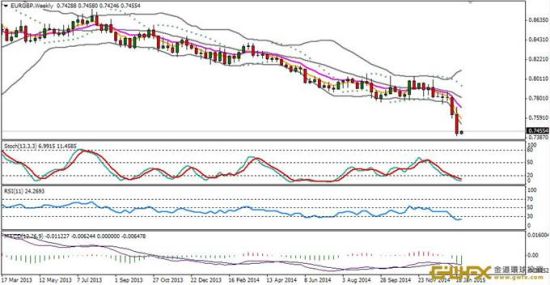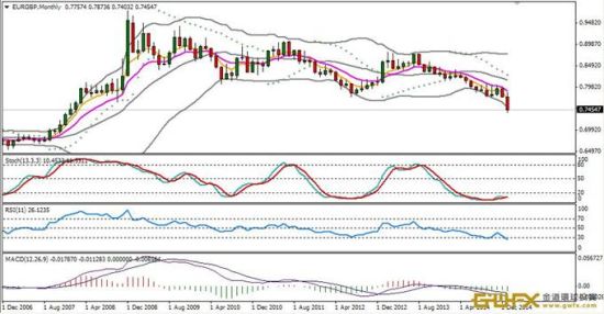 从欧元/英镑的月线图上观察,前期形成头肩顶后出现多个月的横向调整,在去年11月的行情中虽出现了一定的反弹,但是近期的连续大阴线再度延续了前期的强烈下跌,这就完全形成了头肩行情的一个加速展开,汇价目前处于布林指标下轨一线附近,从走势上来看,目前可能将再次加速下跌。趋势指标MACD已经开始缓慢下行,KD指标已经至20一线下方出现了长时间的钝化。关注行情向下的突破给中期的走势的指引,交易上应该全线改为做空交易。