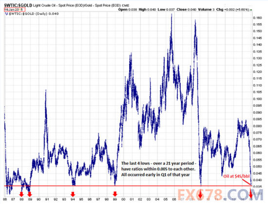 (图2:油价/金价比率在2015年1月底时跌入历史“关键反转点”)