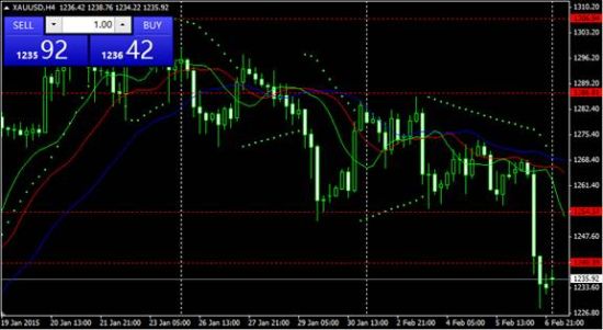 黄金上周五大跌近40美金。日图上看,Alligator鳄鱼指标显示有收拢下跌现象, 抛物线指标显示下跌态势。预计短期将继续震荡下行。下方已经跌破1252和1240附近。上方关注1240压力位和下方1222支撑位。日内操作建议逢高做空。