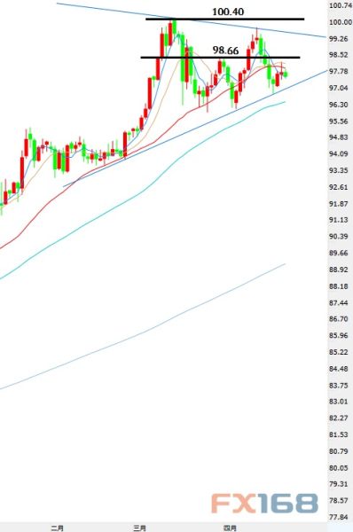 值得注意的是,美元指数也呈现收敛三角形。汇价隔夜在3月31日高点98.66下方受阻,日内小幅回落至97.80附近。美元上周虽有所回落,但是关键位置并未失守,暗示美元短线或很难出现显著的回调。