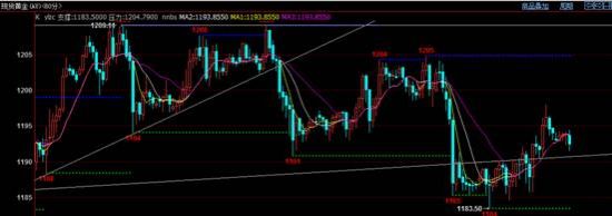 黄金1H图。黄金价格昨日晚盘有所起色,最高到达1198,受压力震荡盘整,目前依附于1190附近震荡盘整,修复指标。今日预计将会持续震荡,激进者可在震荡区间内轻仓多单,稳健者观望为主。