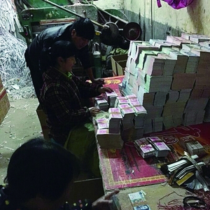 ▲4月19日,在金星印刷厂杂乱的车间内,几名工人在加班包装仿人民币冥币准备出货