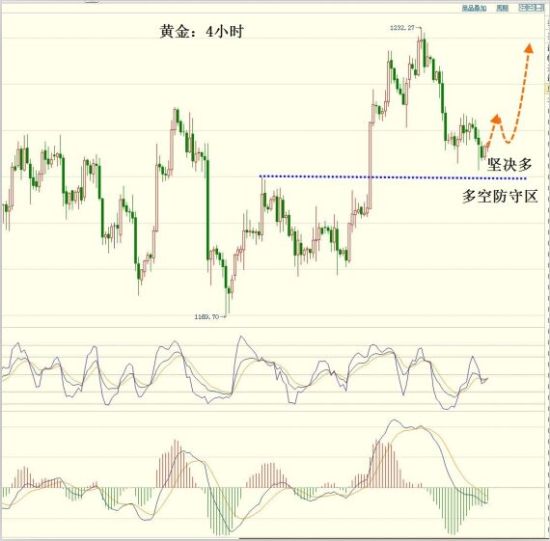 首先,从周K线图中,可以明显的发现,价格上穿1224的压力点之后,几乎市场一边倒的为多头摇旗呐喊助威,而5、10周均线的支撑点就是在1200/1198的位置,试问,这里破了,那后面拿什么来看多?1140形成的双底就是假底,1224的破位就是假破,加息被延时的消息就是忽悠,故而,我认为在此位置将有一波强有力的拉升,而且,幅度绝对不亚于非4月1日的拉升,这一次的高点,我将看至1225/26,如此极端,只有一次强有力的拉升,那么,这样的回调才不会影响多头大军前进的步伐!
