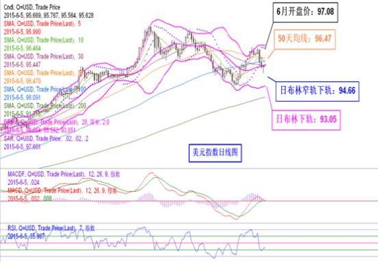至6月5日亚洲盘截稿,当周美元指数以97.08开盘后,呈现小幅反弹后大幅回调走势,最高反弹到97.68,最低下探到94.65的2周低点;欧元兑美元以1.0986开盘后,呈现小幅下探后的大幅反弹走势,最低下探到1.0886,最高反弹到1.1379的2周高点;英镑兑美元以1.5291开盘后,呈现小幅下探后震荡反弹走势,最低下探到1.5168的4周低点,最高反弹到1.5441;澳元兑美元以0.7636开盘后,呈现反弹受阻回落的震荡走势,最低下探到0.7595的7周低点,最高反弹到0.7818;美元兑日元以124.10开盘后,呈现高位强势盘整走势,最低下探到123.74,最高反弹到125.03,创2003年1年来高点记录;美元兑瑞郎以0.9398开盘后,呈现小幅反弹后大幅回调震荡走势,最高反弹到0.9483,最低下探到0.9275的2周低点;美元兑加元以1.2439开盘后,呈现强势震荡整理走势,最低下探到1.2363,最高反弹到1.2562的7周高点;现货黄金以1190.50开盘后,呈现小幅反弹后震荡下滑走势,最高反弹到1204.31,最低下探到1172.55的5周低点。