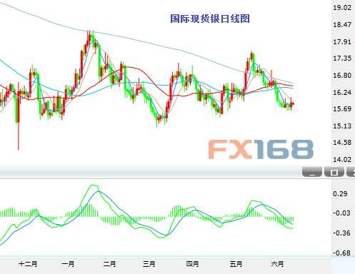 现货白银周一(6月15日)收出带上下影线的小阳线。白银最高触及16.25,最低触及15.81。