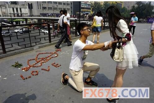 之前,西安一小伙在人行天桥上用荔枝摆成心形图案,向自己喜欢的女孩求婚,据他所说,这些荔枝花了2000多元,差不多是他一个月的工资。而他的台词是:我没房没车没钱,但我会用真心,为你创造幸福,所以,嫁给我好吗?结果,女孩先吃下一颗荔枝,然后说:你太幼稚了!便气愤转身离开。