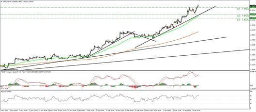 美元/加元在周三欧洲早盘时段上破1.4600 (S1) 阻力位(现已转为支撑位)。在我看来,只要汇价位于取自1月4日低点的短期上升趋势线之上,短期前景就仍为积极。因此,打开的1.4700 (R1)通路还需要1.4600 (S1) 的位置被突破。再来看动能指标,RSI 爬升至70线以上,同时MACD远高于零轴之上,再次抬升并上穿信号线。这些信号检测到了强劲的上行动能,支持了汇价将会继续走高的观点。但是,RSI在70线之上有筑顶迹象。因此,要小心在多头再次发动之前可能会有一波修正回调。日线图中,汇价在取自5月14日低点的上升趋势线之上交易。美元/加元的长期趋势同样也为向上。