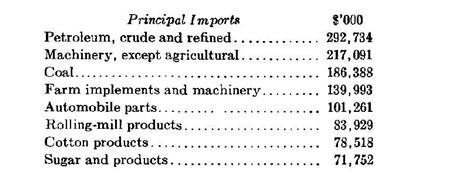 第一次世界大战结束后,加拿大的对外贸易格局发生了巨变。在此之前,它的主要贸易对象是西欧;在此之后,由于欧洲经济受损严重,加拿大只能向西欧出口商品,而从美国进口所需物品。就这样,加拿大逐渐被绑在了美国的经济战车上。它曾经多次提高关税,抵制美货,可惜自己选择的余地不大,最后仍然不得不承受美国的限制。1931年英联邦成立后,加拿大自治领可以自主决定外交政策,与美国的合作更加密切。从1939年到1948年,加拿大从美国进口的商品总额,由近5亿美元增加到19亿美元。进口的物品,主要有石油、钢铁、机械设备、纺织品、热带和亚热带食品等。与此同时,由于美国降低关税,加拿大对美国的出口总额也出现了迅速增长。