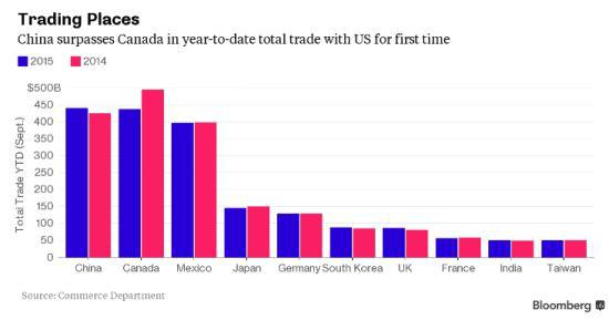 2015年中国首次超过加拿大,成为美国第一贸易伙伴