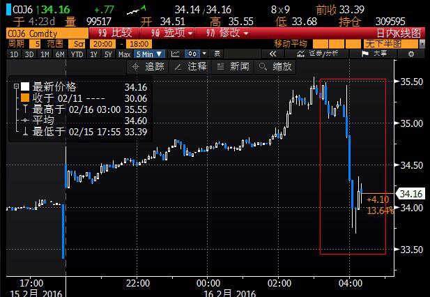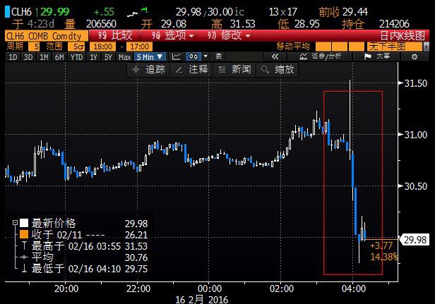 汇通网2月16日讯——周二(2月16日)欧洲时段国际油价短线重挫逾1美元,美原油3月期货一度回吐早些时候的全部涨幅并刷新日内低点至29.75美元/桶,布伦特原油4月期货一度刷新日内低点至33.73美元/桶,因沙特、俄罗斯、卡塔尔和委内瑞拉石油部长的闭门会议已经结束并作出冻结石油产量的决定,市场对产油国达成协议减产的愿望落空。
