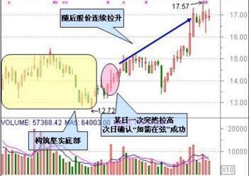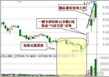 股价在低档持续小幅无量滑落,某一日正常开盘后拔地而起,报收大洋心啊,统吃此前近10根K线,成交量亦放出巨量。此K线组合往往是受某些突发性消息的刺激,主力机构匆匆忙忙拉高建仓的表现。