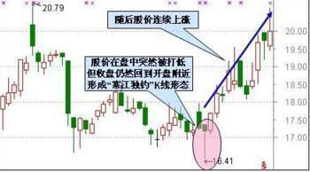 股价在低档长期窄幅盘整后,底部已经盘实,没有了下跌动力。部分敏感的投资者隐约感觉到市场回暖,开始趁低吸纳, 使股价开始缓缓向上。某一日,股价正常开盘后被大幅打低,但收盘价扔距开盘价不远。这种K线形态为主力拉抬前的最后一次震仓。