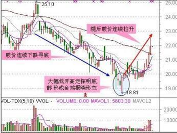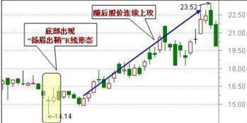 股价深幅下挫,在低档收出大中阴线,次日向下跳空拉出一根长下影线,表示在低档已经有主力大量接盘,支撑十分强 劲,多为买入信号,预示后市将反弹。第三日若开出高盘,则可视为反弹开始。此K线组合的上下影线前后皆无遮拦,犹如宝剑已经出鞘,即将斩妖伏魔,故称“扬 眉出鞘”。