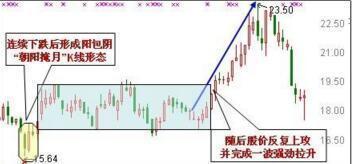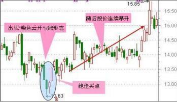 在连续下挫行情中,股价在低位收出大阴,空方大获全胜。次日却被多头打个措手不及,以高价开盘并最终红盘报收。此K线组由阴孕阳构成,犹如雨后虽然乌云满天,却已遮不住太阳的光芒,正所谓“晓色云开,春随人意,骤雨才过还晴”,故称“晓色云开”。