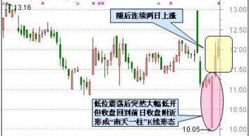 股价在低档横盘整理过程中,以巨大的向下跳空缺口开盘,随后即快速向上,回到前一日收盘价附近收盘,从而在K线图 上留下一根实体很长的大阳柱。这是主力震仓吸货的明显信号”。