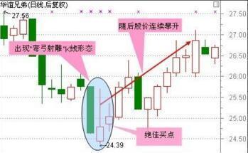 股价在低位加速下跌,收出一根向下跳空的弓形线,如果第二天能够开出高盘,则股价已经短线见底,即将展开反弹。此K线组合是在低位跳空向下的弓形线,箭尖向上搞搞耸起,暗示多头已经开始反击。