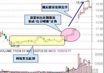 股价经长时间横盘整理后,底部已经构筑得十分坚实,向上突破只是时机问题。果然,某一日股价被放量拉抬,以长阳报 收,创出近期新高。该K线形态 是低档长期盘整后的突破信号,预示后市股价将大涨。