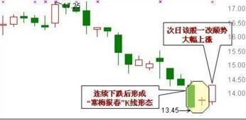 股价在低档拉出大阴线,次日却只能收出一根孕育在大阴线实体之中的小星星,显示空头已经弹尽粮绝,局面将改由多头主控,股价即将反 弹。