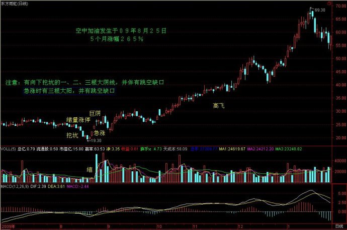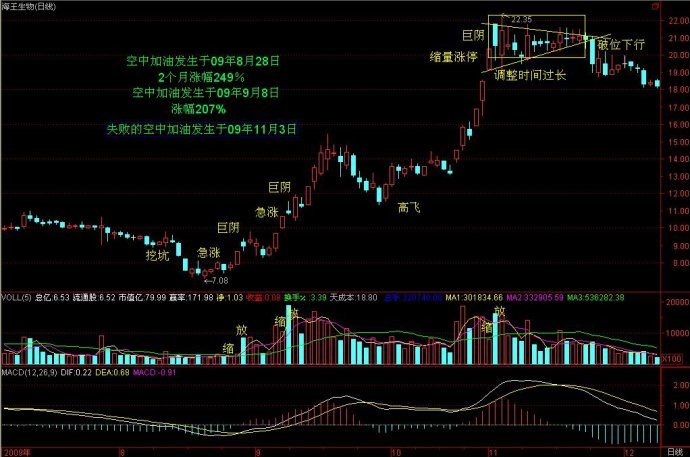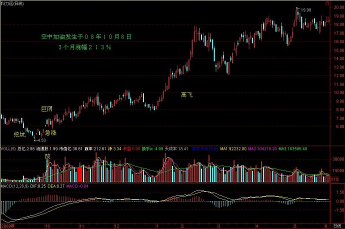 何为空中加油?答:股价遭人为打压,向下挖坑,迅速反升。连续性的上涨出现缩量涨停,次日放出巨量大阴线。这个时候,跟风盘、获利盘、恐慌盘纷纷倒戈,夺路而逃。仅仅短暂整理后,再次向上突破,股价从此扶摇直上,鹏程万里,远走高飞! 涨停板分析博客把它概括成八个字:挖坑、急涨、巨阴、高飞。
