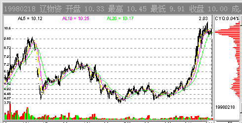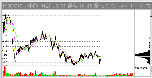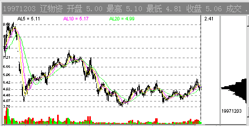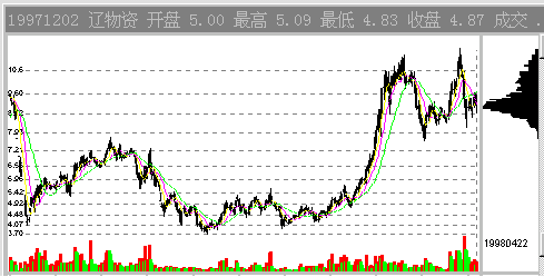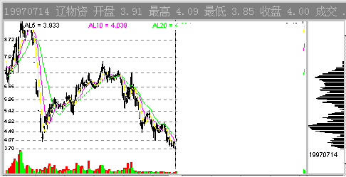 97年7月14日的辽物资(0511),此时,股票当前价位上方是一层一层的套牢盘。从中线的角度看,是没有多大的上涨空间的。因为一旦股价大幅上涨,这些套牢盘的的解套出逃行为会耗尽多头的能量。此时假若股价上涨的话,4.7元附近的CYQ套牢峰会对股价构成巨大的压力。图1-2-3中显示了该股其后的走势,充分证明了这个压力的作用。
