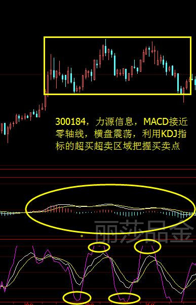 3,横盘震荡:在横盘震荡的箱体中,MACD均线无论是在零轴线上方还是在零轴线的下方,都会特别的贴近零轴线,或者直接与零轴线重叠,这个时候重点关注KDJ,高位超买做空,低位超卖做多即可。