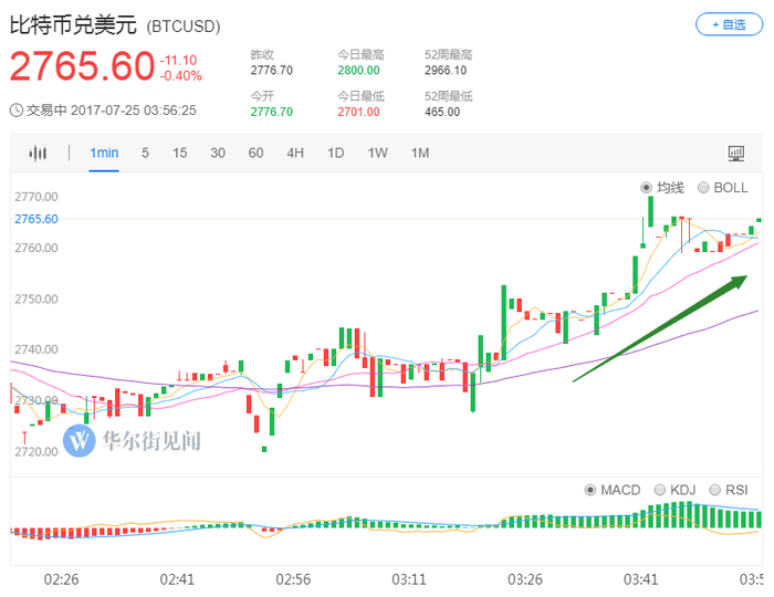 今日,比特币盘中上涨,目前在2765.60美元上下波动。