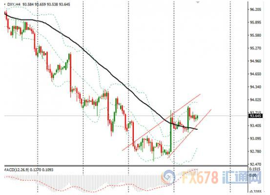4小时图中,美元指数目前运行在楔形区间内,技术指标上来看,目前指数升至60日均线上方,MACD的柱值也转为正值,这暗示短线美指仍然存在上行的动能,但在上行的力度可能有限,因为楔形很可能会形成中继形态。