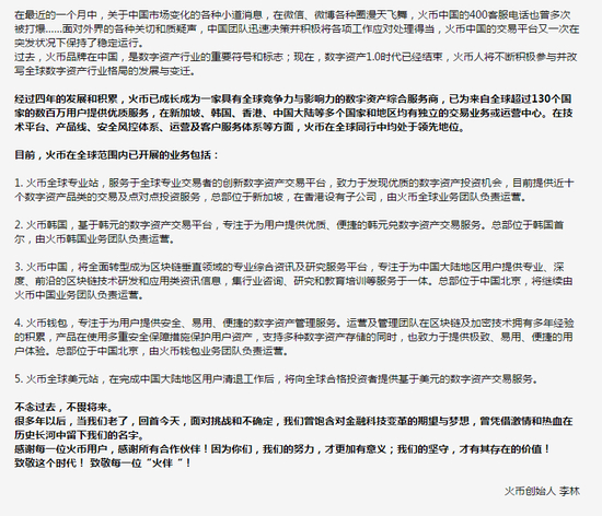 火币创始人李林:关于2017年10月31日后火币中国地区业务调整的说明