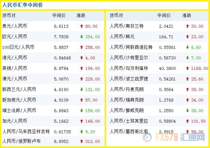 美元兑人民币报6.6113,上调80.00点;欧元兑人民币报7.7838,下调354.00点;