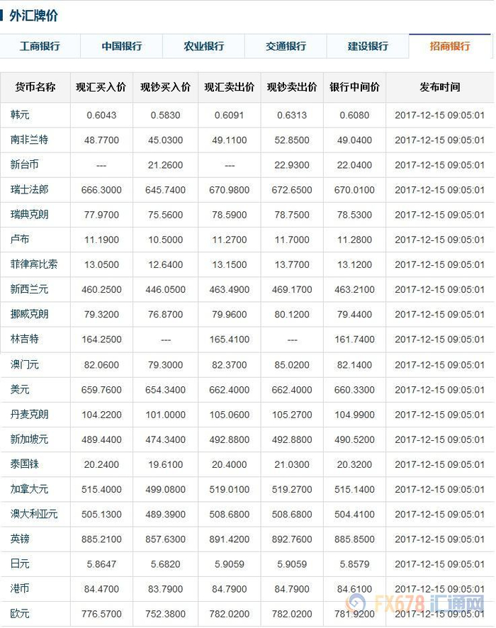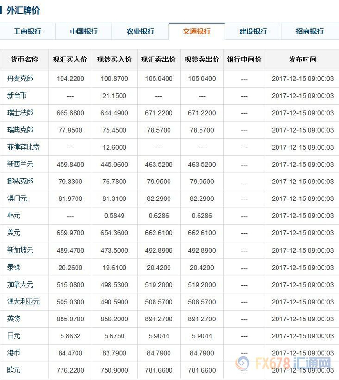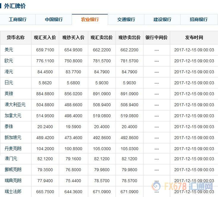 以下为2017年12月15日上午六大银行外汇牌价一览(对应图片中有具体更新时间):