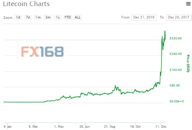 据coinmarketcap.com的数据,过去五天莱特币涨幅已经超过9%,达到330.07美元。上周三(12月13日),莱特币在一天之内上涨了60%,达到341.72美元的历史高位。11月初,莱特币的价格仅为88美元,而年初时仅为4.33美元。