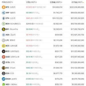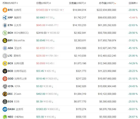 12月22日,数字货币全线大跌,比特币部分交易所价格跌破13000美元,日内跌近20%。以太币、比特币现金、莱特币均跌超20%。