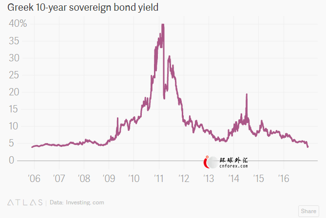 最新债券市场的数据显示,10年期希腊国债收益率本月一度跌至4%以下,为11年来最低。