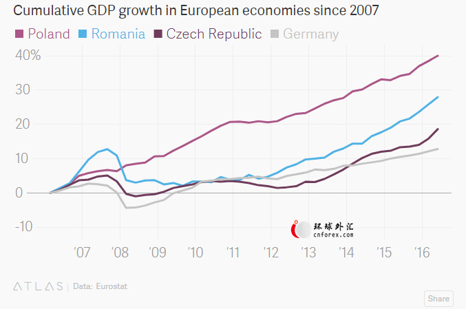 在欧元区之外,其他欧洲经济体的经济增速甚至更大。在过去的几年里,东欧三个最大的经济体已经超过了德国的增长速度——波兰、罗马尼亚和捷克共和国正经历着经济高增长、低失业率和可控通货膨胀的“金发女孩”黄金时刻。