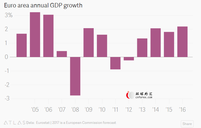 据欧盟委员会(European Commission)的数据,2017年欧元区的经济增长率预计将达到2.2%,是十年来的最快增速。