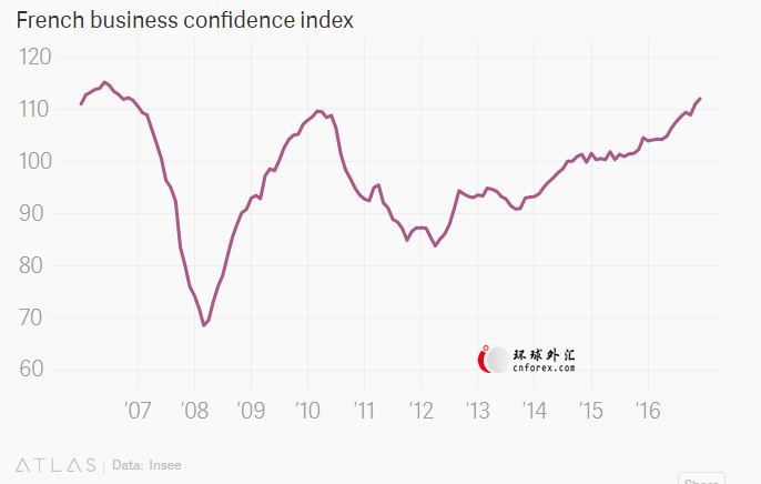 与市场交易员对欧元的最多热情相匹配的是,欧元区成员国的商业信心指数也已达到了创纪录或多年来的高点。在法国,今年大选上深受民众欢迎的总统马克龙正在推动劳工改革,令该国商业信心指数达到了2007年以来的最高水平。法国国家统计局的数据显示,该指数的最新读数为112,远远高于100的长期平均水平。